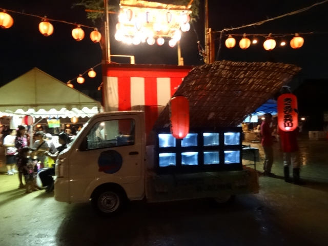 途中でかなり強めの雨が降りましたが、お祭りは無事開催。たくさんの人が遊びに来てくれました。みなさん、わりと魚に詳しい。夜になって提灯に明かりがともり、水槽はとってもいい雰囲気でした。