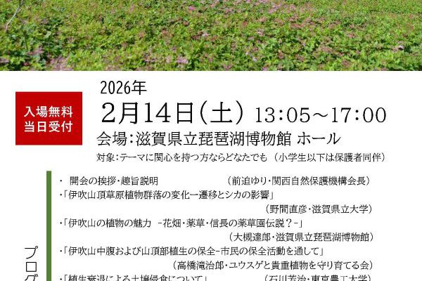 「花の百名山伊吹山草原の多様性回復をめざして-研究者、市民、行政との連携-」 日時:2026年2月14日(土) 13:05~17:00会場:滋賀県立琵琶湖博物館 ホール 【プログラム】 ・開会の挨拶・趣旨説明         (前迫ゆり・関西自然保護機構会長)・「伊吹山頂草原植物群落の変化ー遷移とシカの影響」(野間直彦・滋賀県立大学)                                 ・「伊吹山の植物の魅力 -花畑・薬草・信長の薬草園伝説?-」 (大槻達郎・滋賀県立琵琶湖博物館)                 ・「伊吹山中腹および山頂部植生の保全-市民の保全活動を通して」 (高橋滝治郎・ユウスゲと貴重植物を守り育てる会)      ・「植生衰退による土壌侵食について」          (石川芳治・東京農工大学)・「伊吹山保全対策滋賀県・米原市合同プロジェクトチームの取組」 (滋賀県自然環境保全課)                                ・「伊吹山山頂部の植生変化に伴う陸産貝類の減少」 (金尾滋史・滋賀県立琵琶湖博物館)        …