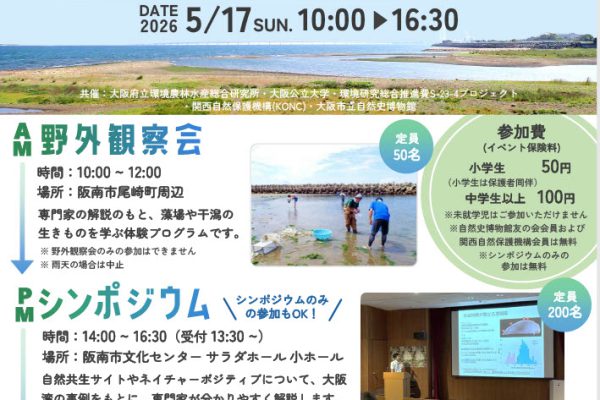 大阪湾で学ぶ自然共生サイトとネイチャーポジティブ -産・官・学・民、そして自然のコミュニケーションを考えよう!― 近年、ネイチャーポジティブ(自然の損失を止めるだけでなく、回復させていくという考え方)の実現に向けた取り組みが世界的に進められており、日本ではOECM(保護地域以外で生物多様性保全に貢献する地域)の拡大に向けて自然共生サイトの認定が推進されています。生物多様性の重要性は広く認識されつつありますが、ネイチャーポジティブや自然共生サイトの認知度はまだ十分とはいえません。 このフィールドシンポジウムでは、自然共生サイトやネイチャーポジティブについて、大阪湾の事例をもとに、専門家が分かりやすく解説します。フィールド観察会とシンポジウムの二部構成で開催します。 <午前の部:フィールド観察会> 日 時:5月17日(日)10時~12時(観察会は雨天の場合中止) 場 所:阪南市尾崎町 男里川河口 定員:50名(申込み多数の場合は抽選) 対  象:小学生以上(小学生は保護者同伴) 参加費:中学生以上100円、小学生50円(関西自然保護機構会員は無料) ※申込みが必要です…